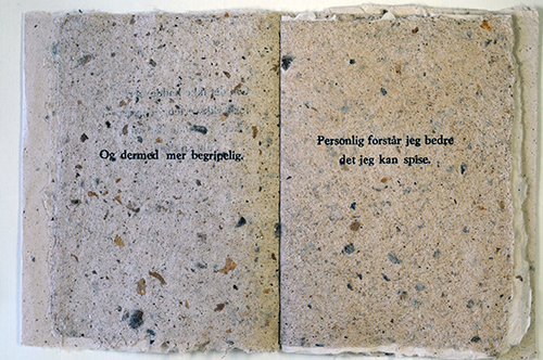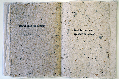 "Ubegripeligheten" er en spisbar bok trykket på håndlagde papirer av avokado og abaca, illustrert med et dyptrykk av en avokado. Boken undersøker begripelighet - og stiller spørsmålet om det er lettere å forstå noe om man kan spise det - og i tilfelle, om man skulle spise denne boken, er det selve boken man forstår, eller forstår man avokadopapiret?